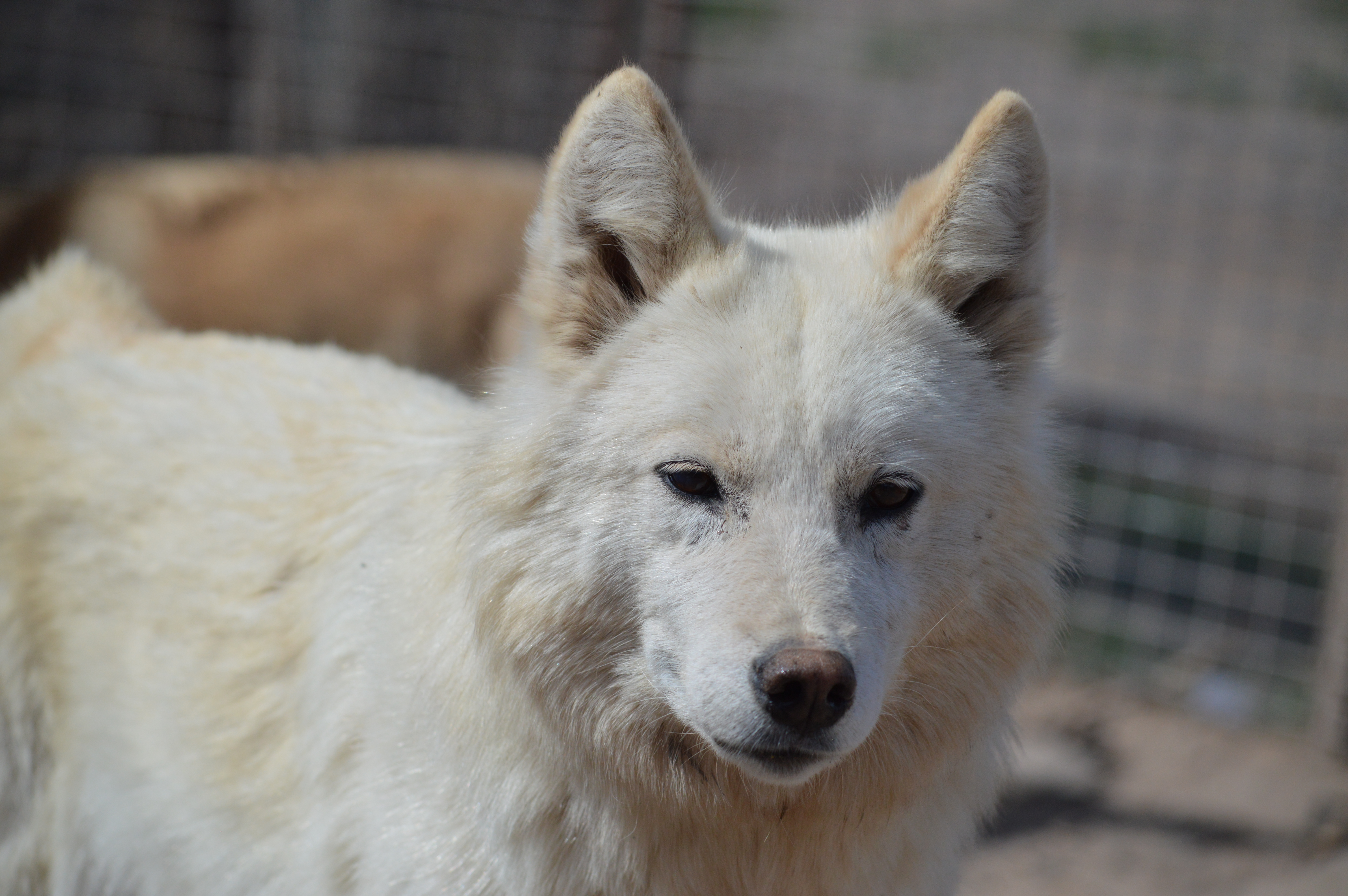 Ember was the only animal without a penmate to be rescued by WolfWood. Her inquisitive nature charmed Paula. It was decided to take a low-risk gamble that she would get along with one of the pre-existing residents of WolfWood, and thus would not require an extra pen. This gamble proved to be successful, and Ember was paired with Takini, a sweet and patient 2 year old male who had arrived at the refuge not long before her. Ember is smart and can work out almost any problem. She is weary of humans, but still curious about them. She will give gentle boops with her nose to people who sit with her, and will take treats that she deems worth eating. Ember has also proven to be one of the weaker animals of the Ohio rescue. It doesn’t take much physical activity to leave her sore, even months after getting out of her small cage in the fur farm. She compensates for this by sunbathing on her pallet, with her new partner Takininearby.
