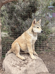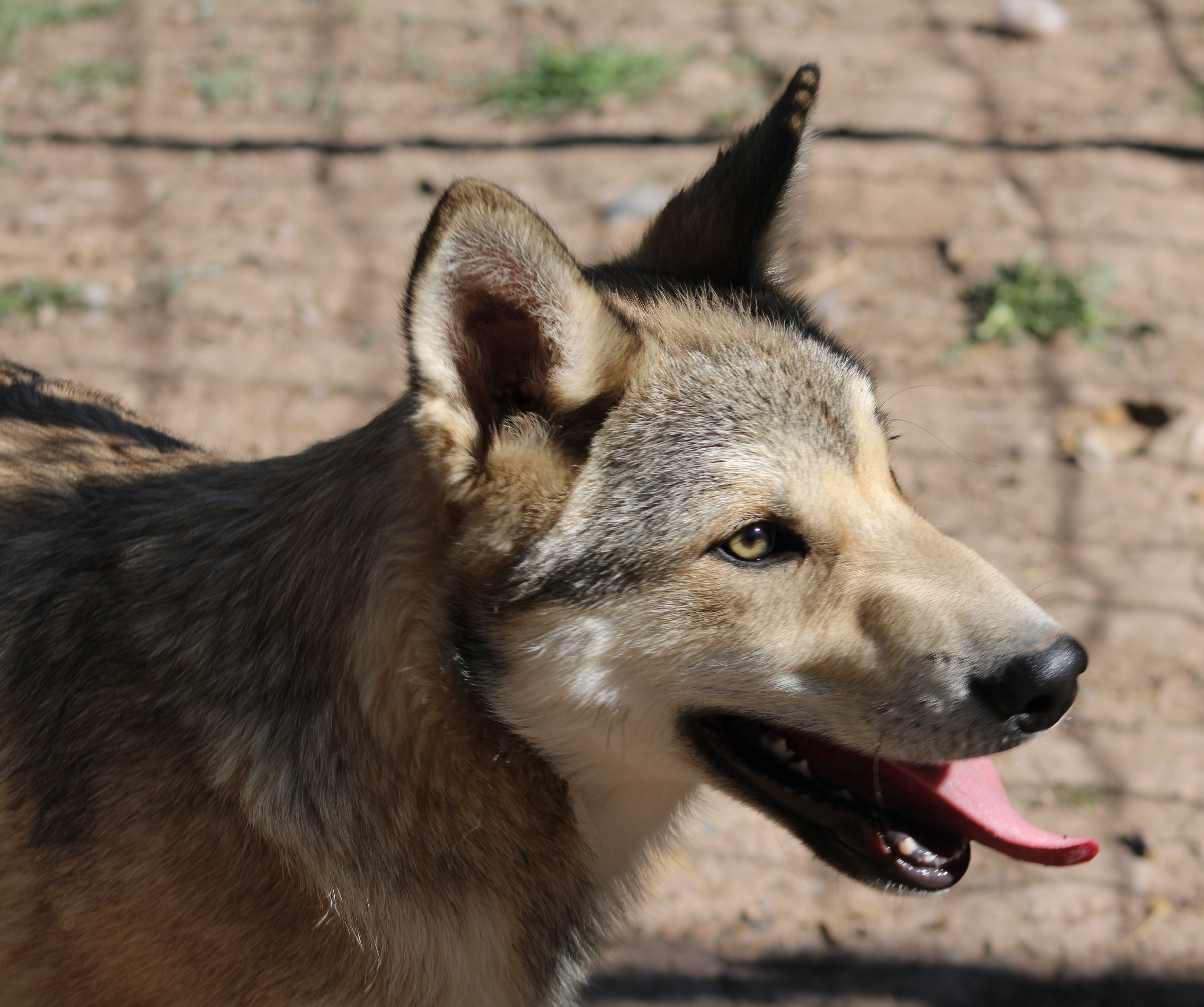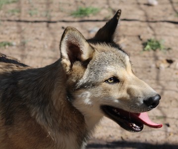 Honu lived with Agustus in Ohio and continues to at WolfWood. In 2025 he was estimated to be around 3-4 years old. Honu started out as one of the shier animals of the rescue. She has come around significantly since being rescued and is now one of the more playful animals. She and Gus will playbow and run around like crazy whenever someone enters their enclosure for feeding time. She is very gentle through the fence at taking treats and will sometimes give a little kiss. Honu loves her new life and is happy she gets to spend it with her partner Agustus.