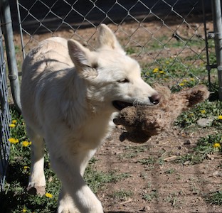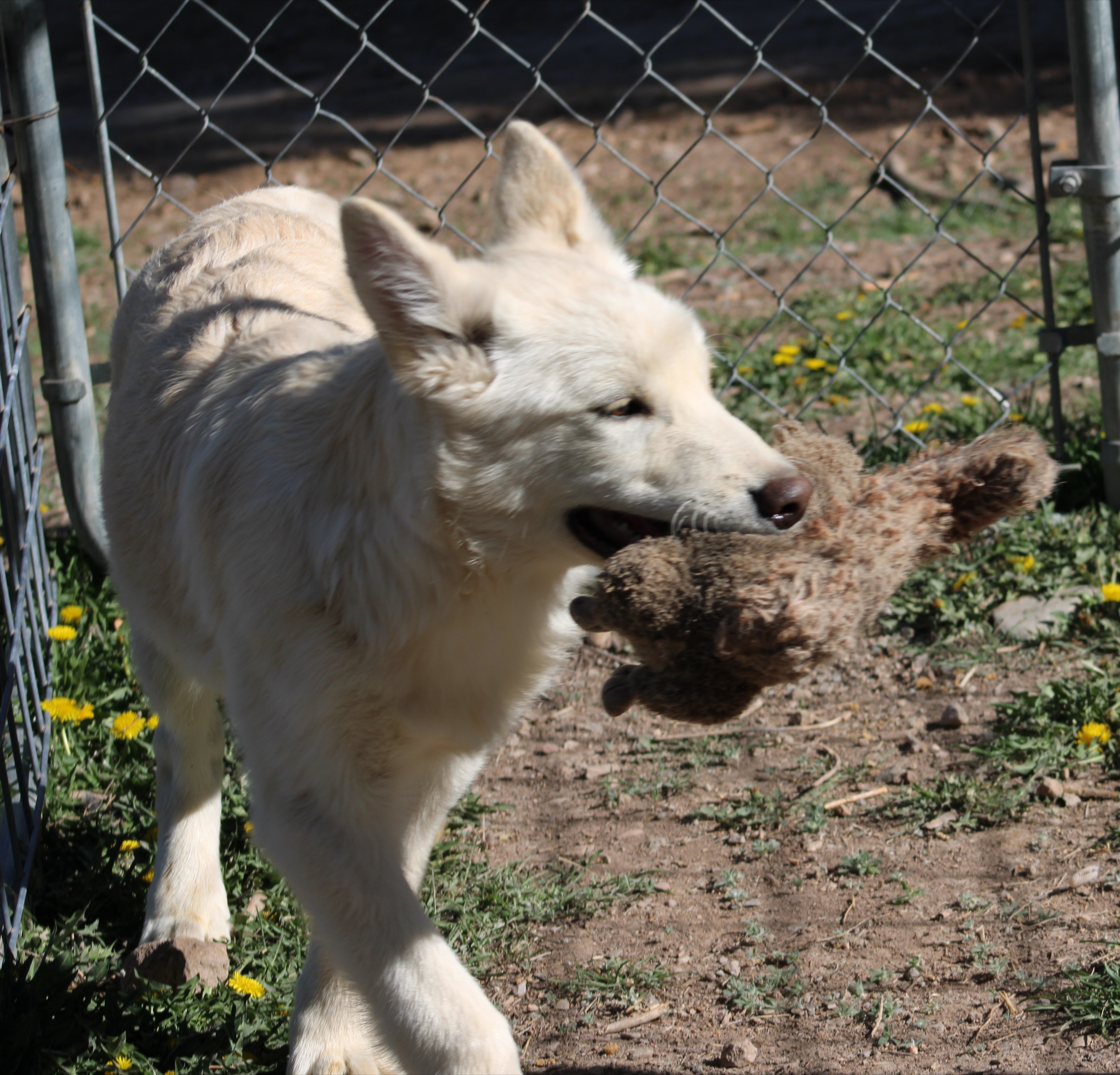 Nanuk is one of the puppies rescued with Knight and Truckee at only a few weeks old. She is a sweet and submissive girl. She loves people but can get a little overwhelmed with crowds. If she gets past this we are hoping she will make a good ambassador animal with her littermates. Nanuk loves to carry things around in her mouth as a binkie. She also loves to play with her brother Knight.