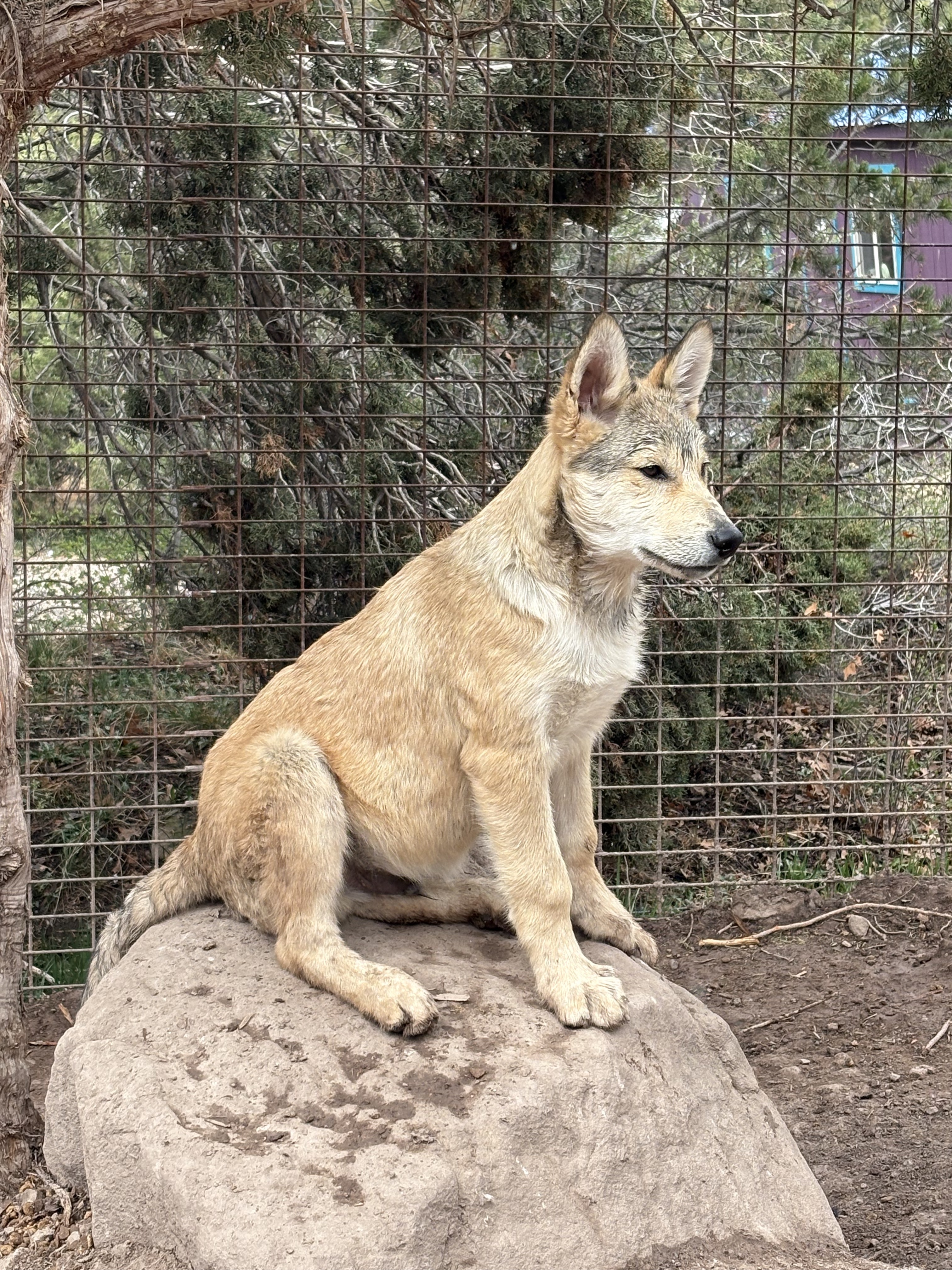 Summit came with Buckee and Zia. He was in the smallest wire cage among the wolfdogs with no breeder box to go into to escape the harsher elements. The three of them were piled onto each other with little room to give each other space. Summit seemed to often be used as a pillow by Buckee and so was exposed to the freezing metal of the cage more than them. He also had a skin condition known as demodex mange that had become so chronic he had scratched most of his fur off. Any exposed skin that touched wire was frostbitten by the time WolfWood got him. His treatment for mange is still ongoing. Thankfully it only requires an oral medication once a month, but due to how chronic the condition is, he will need at least six months of medication. In 2025 he was estimated to be around 7-8 years old. He is a laid back guy who enjoys the company of his two slightly crazier counterparts.